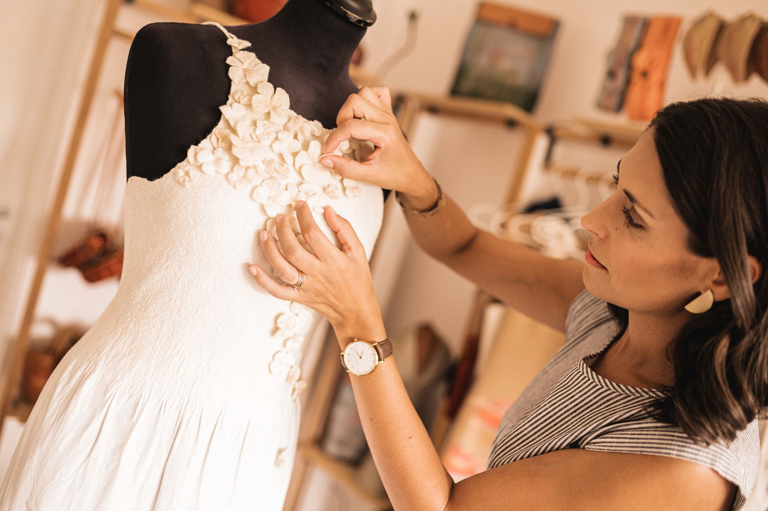 Számomra alapvető fontosságú a környezetterhelés minimalizálása, ezért kizárólag természetes, könnyen lebomló anyagokat, vagy újrahasznosított textileket használok. Az alkotás során nincs lehulló, felesleges anyag, ami azt jelenti, hogy egy-egy ruha, táska előállítása során nem termelődik ruhaipari hulladék köszönhetően a gondos tervezési folyamatnak és a nemezelés sajátos technikájának.